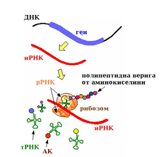 Специфичността на един белтък се определя от линейния ред на аминокиселините в него. Този ред зависи от реда на нуклеотидите в нишката на ДНК. Генетичната информация е шифрована в ДНК, тя трябва да се разчете и “преведе”. Това се осъществява с помощта на РНК. РНК има задача да ”препише” информацията от нишката на ДНК, да пренесе тази информация до рибозомите и там да се извърши белтъчен синтез.