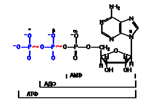В АТФ и в останалите нуклеозидтрифосфати има три фосфатни връзки: α, β и γ. Първата е обикновена естерна, а останалите две са макроергични (пирофосфатни). Най-често за работа се използва енергията на γ-връзката, и по-рядко тази на β-връзката. В АДФ и в останалите нуклеозиддифосфати има една макроергична пирофосфатна и една естерна връзкa (фиг. 27). Адениловата система (АДФ/АТФ) е посредник между екзергоничните и ендергоничните процеси. Окислително фосфорилиране е синтеза на АТФ от АДФ и неорганичен фосфат (Ф), за сметка на енергия, отделена при окислителен процес. Разграждането на АТФ до АДФ и Ф или до АМФ и пирофосфат (ФФ) осигурява протичането на ендергоничните процеси.